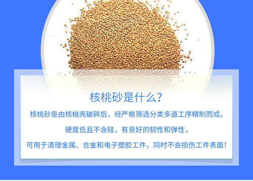 2、核桃砂由核桃殼破碎后,經(jīng)嚴(yán)格篩選分類多道工序精制而成。其型狀顆粒均達(dá)到國際工業(yè)標(biāo)準(zhǔn),核桃砂應(yīng)用于電子產(chǎn)品上后續(xù)拋光去除多余膠類;橡膠、塑膠!因其有良好的韌性和彈性,也可用于清理金屬、合金和電子塑膠工件,不會損傷工件表面!核桃砂用于噴砂清理行業(yè),如有噴漆、銹跡、化學(xué)物資等存在的工件表面,有去除殘存物和表面光潔的作用!