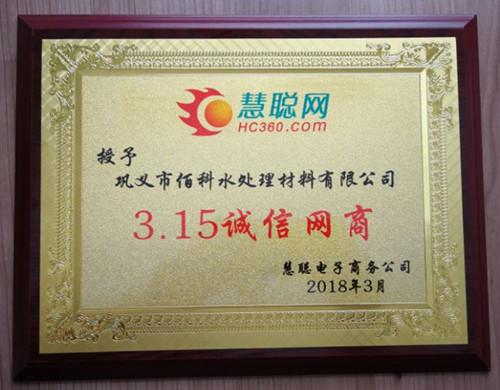 鞏義市佰科水處理材料有限公司經3.15誠信單位評選,我們佰科公司被評為“3.15誠信網商” 。終于在6月17日收到了來自慧聰官網郵寄的3.15誠信網商牌匾。鞏義市佰科水處理材料有限公司十多年來一直響應誠信經營的原則,贏得了不同行業新老用戶的青睞!